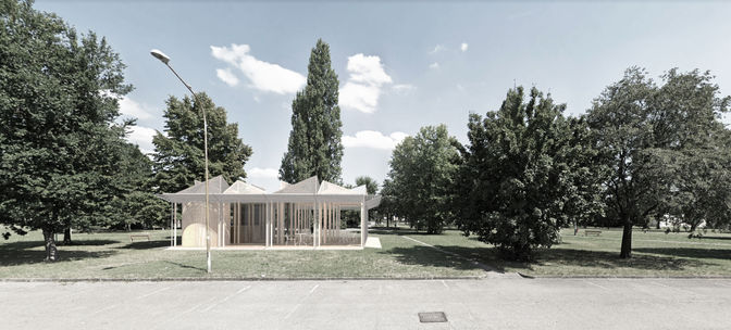 Il progetto riguarda lo sviluppo di linee guida per la realizzazione di chioschi da collocarsi all’interno di alcuni parchi individuati all’interno del territorio comunale di Carpi. Il concept proposto si basa sull’idea del “padiglione nel parco”: un ampio spazio coperto a pianta centrale che non sviluppi fronti principali e fronti secondari e che possa essere attraversato alla vista.La struttura si fonda su elementi di base modulari da aggregare e combinare a seconda delle necessità. Il modulo base previsto misura in pianta 320x320cm ed è composto da un telaio in legno prefabbricato. Il ricorso al legno come principale materiale risponde ad un criterio di coerenza legato alla collocazione dei padiglioni all’interno dei parchi cittadini oltre che ad esigenze di sostenibilità ambientale; il suo assemblaggio a secco garantisce inoltre un’ampia reversibilità delle opere.L’edificio è rivestito esternamente da un involucro di pannelli forati, dotati di sistemi automatizzati di apertura e chiusura che amplificano nelle ore serali l’effetto “lanterna” esercitato dal chiosco nel parco. La particolare morfologia della copertura serve a schermare i raggi solari e si rifà a forme maggiormente organiche che richiamano quelle della natura e in particolare le fronde degli alberi.